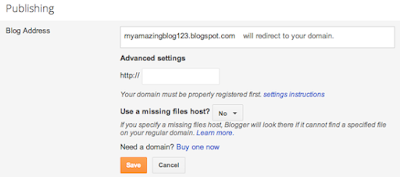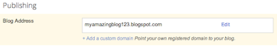 8. After your settings have been activated, you need to make sure Blogger knows about your custom domain so that Google can direct readers to your blog. Just head back to Blogger and update the information on your Settings | Basic tab. Find the area for “Publishing,” and click the link to add a custom domain.