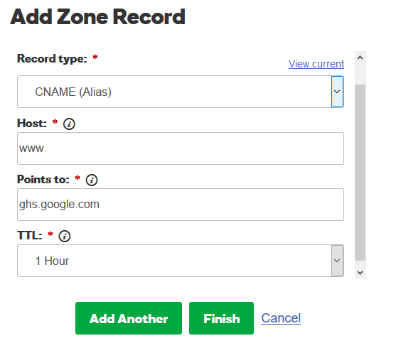 6.a) In the first CNAME box type the following Name = “www” and Points to = “ghs.google.com”like shown below