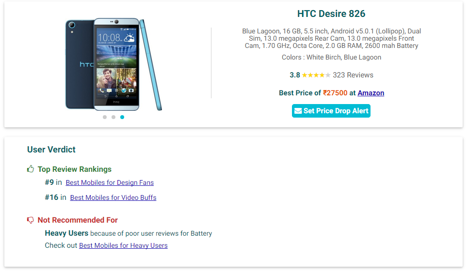 Another unique highlight is the AspectWise User Verdict for a gadget, which lets you know how a gadget ranks for different kinds of users, like a mobile might be great for Camera Lovers but not so good for Gamers. For example, the HTC Desire 826 is recommended for Design Fans and Video Buffs, but not for Heavy Users, because of its poor battery life.