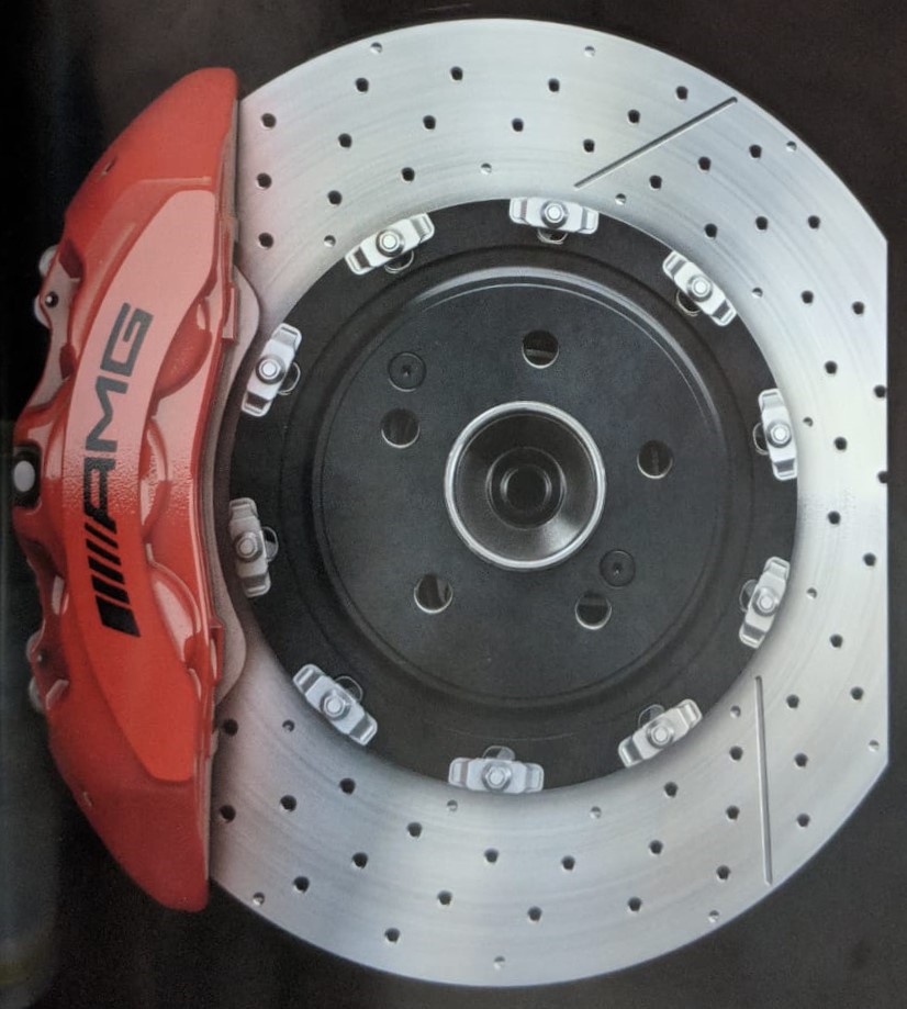 The AMG high-performance brake systems has red brake calipers (which is internally ventilated & perforated) and specifically designed for high performance and enhanced braking force.